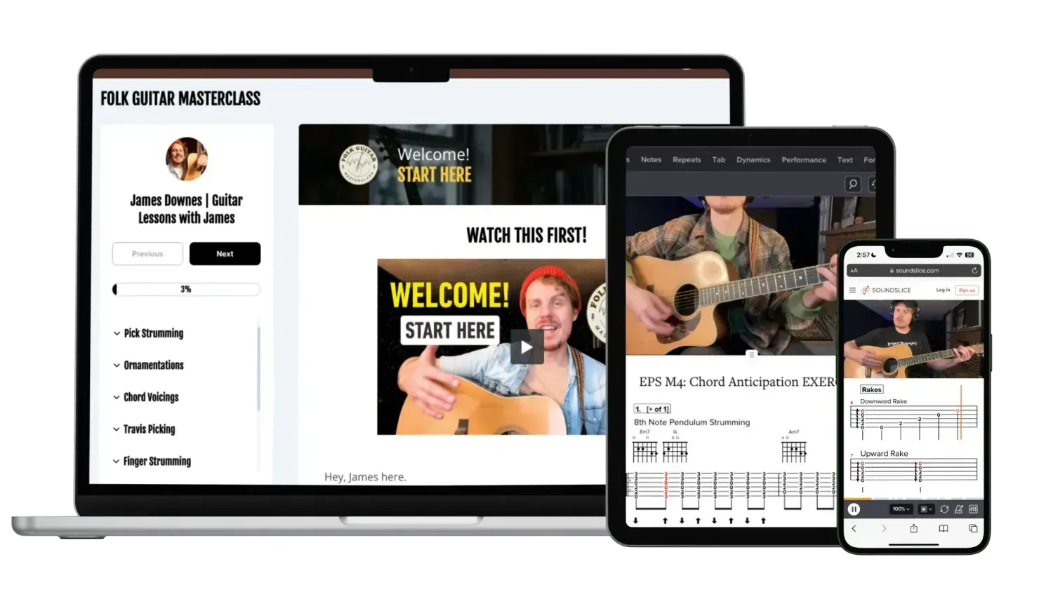 The Folk Guitar MasterClass uses Soundslice, the world’s most advanced video + tab technology. It perfectly syncs the video with scrolling tablature — so you see, hear, and play every note together in real time.